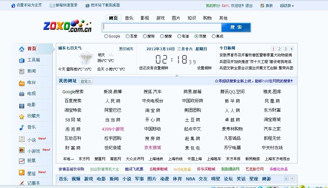 再看下面,好家伙 这做网站的还真把分类分的细致,什么网页呀 图片呀 音乐呀 影视呀 游戏呀 购物呀 知识呀 其他呀,然后搜索框下面就是